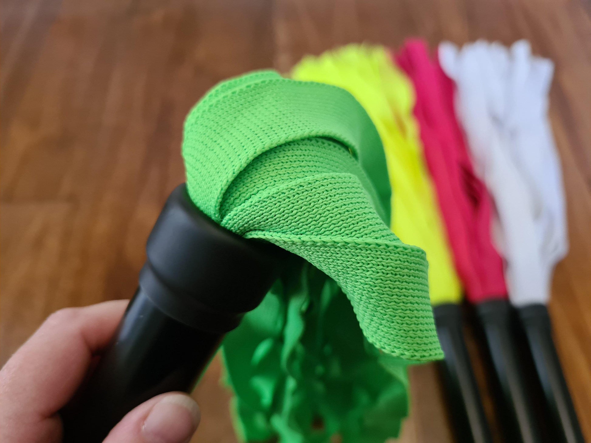 The falls are made from durable 25 mm polyester ribbon, set into a black metal handle finished with a non-slip criss-cross grip for secure handling. A built-in hanging loop makes storage and display easy.